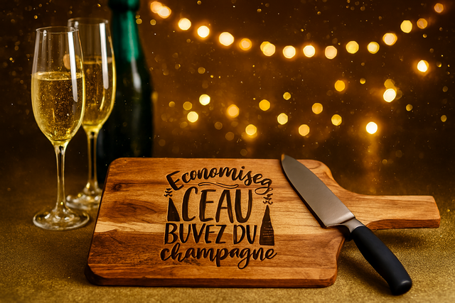 Découvrez mes planches à découper et plateaux en bois naturel, gravés au laser faites graver ce qui vous tient à cœur.
