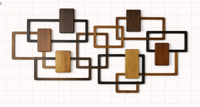Composée d’un jeu de rectangles entrelacés dans des tons naturels – bois miel, noir et doré –
